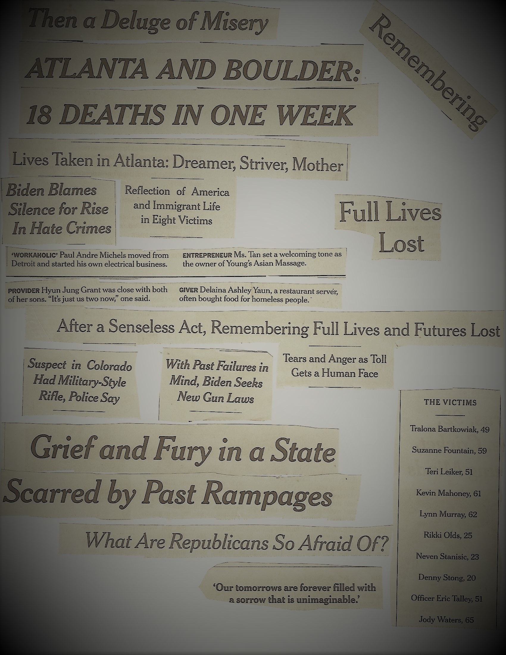 A cento, sorta, taking some lines from news sources like the BBC and the New York Times, to honor the lives of the victims in Atlanta.